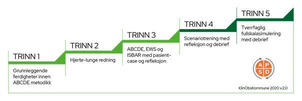 På det første trinnet, som gir grunnleggende kunnskap om ABCDE metodikk, deltar alle ansatte. Også studenter og elever som på gjennomføringstidspunkt har praksis i våre tjenester og tilkallingsvikarer får tilbud om å delta. Dette gir gevinst i form av et gjennomgående økt fagfokus i tjenestene og økt kvalitet i kommunikasjon mellom ansatte uavhengig av hvilket kompetansenivå man har fra før – også på tvers av tjenester. Sist men ikke minst gir dette økt kvalitet i det pasientrettede arbeidet, og skal sikre at pasientene ivaretas med rett kompetanse, til rett tid, av rett personell på rett sted når endring, forverring eller akutt sykdom inntreffer.