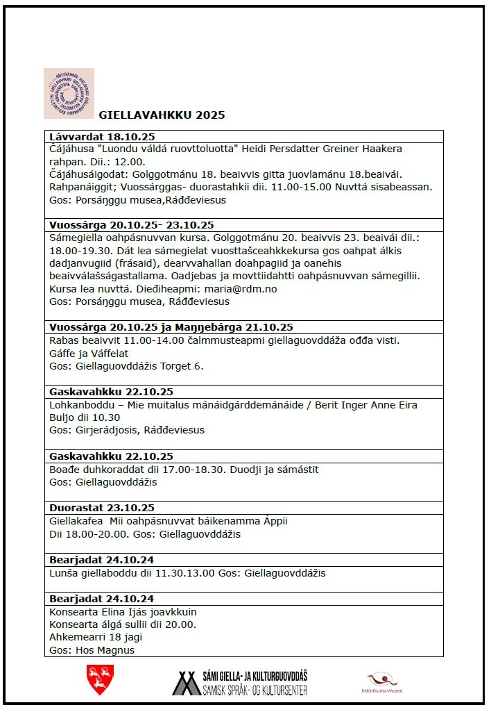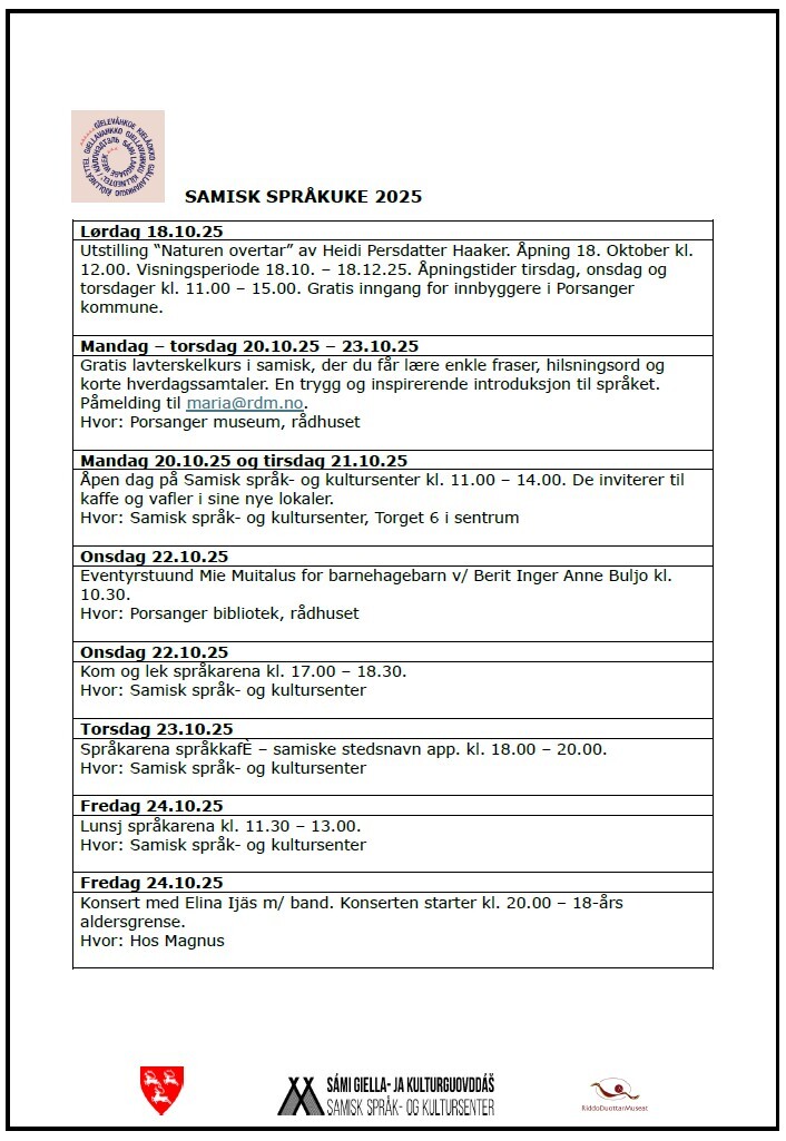 Samisk språkuke er et initiativ fra Sametinget, der målet er å løfte statusen til de samiske språkene og øke kunnskap om samiske språk og kultur i hele samfunnet. I Porsanger markeres denne i regi av samisk språk- og kultursenter og RiddoDuottarMuseat, med et variert program gjennom hele uka. Programmet finner du nedenfor.
